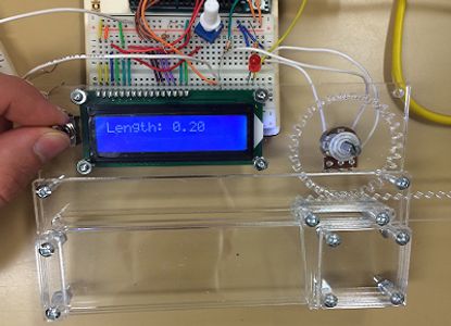 I developed a caliper with 3 classmates that has the ability to measure lengths between 0 mm to 120 mm with a calculated maximum uncertainty of 11 mm. The caliper uses a rack and pinion to convert linear displacement into rotary motion, a potentiometer to convert the angular displacement of a gear into units of voltage, and a LCD to display the measurements to the user.